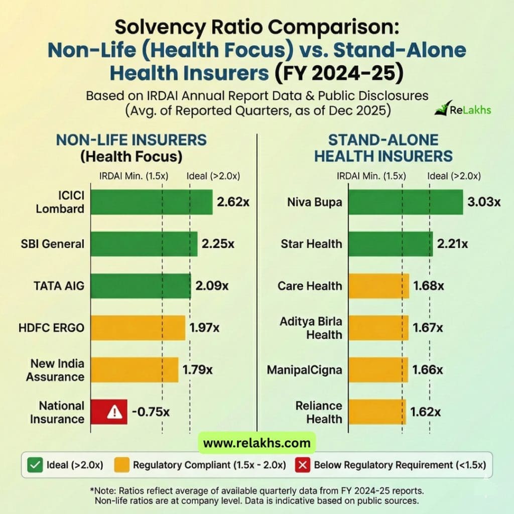 - A general insurer might have a lower solvency ratio because it is more efficient at generating profits across multiple lines (like Motor, Fire), whereas a stand-alone health insurance is “all-in” on healthcare, making it more vulnerable to sharp spikes in medical costs.