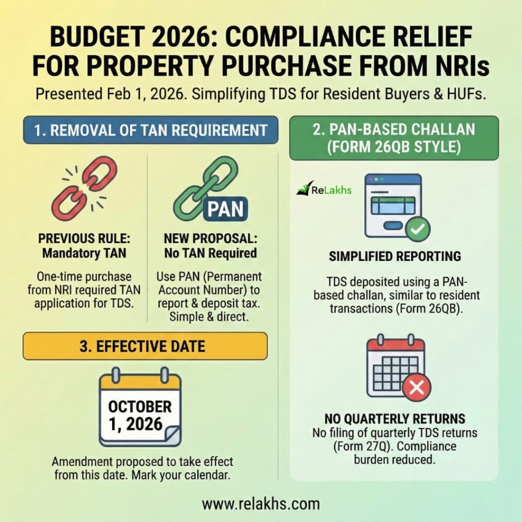 The Union Budget 2026, presented on February 1, 2026, has introduced a significant compliance relief for resident individuals and HUFs (Hindu Undivided Families) purchasing immovable property from Non-Resident Indians (NRIs).