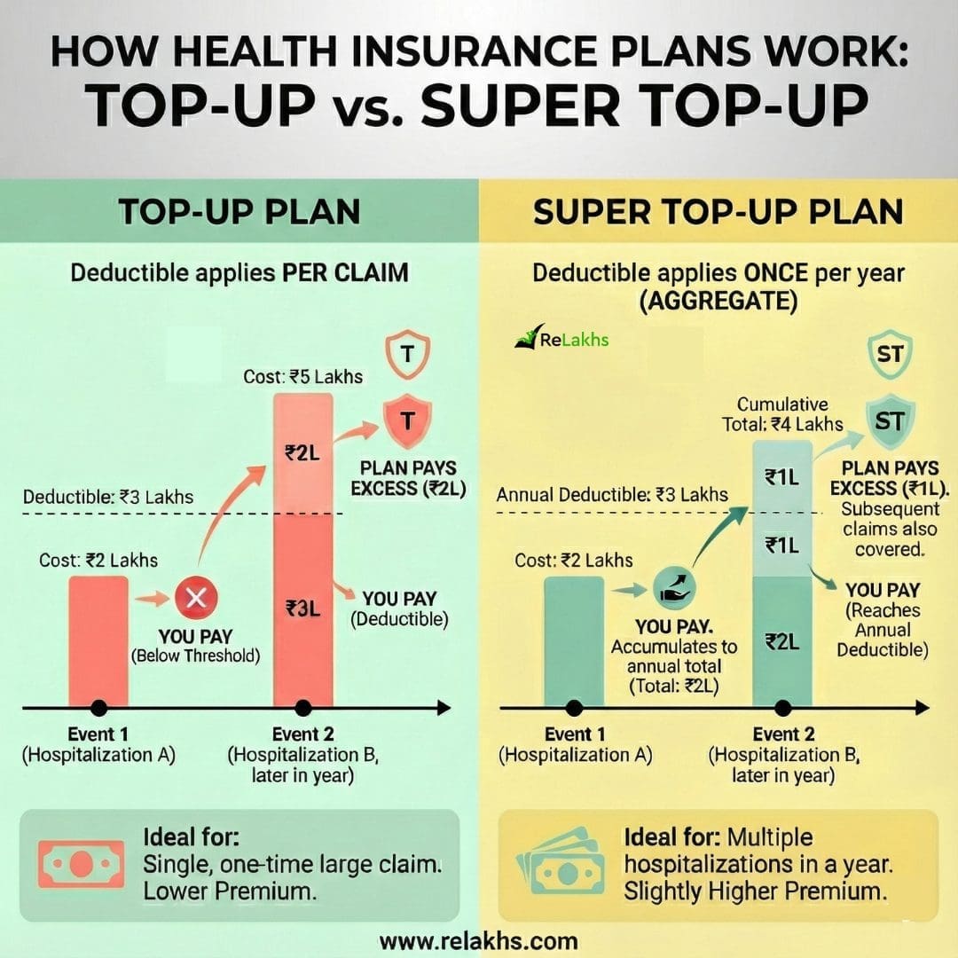 You can think of this just like topping up your mobile balance. Your regular mobile plan gives you a base balance or data limit. Once that is fully used, the top-up recharge kicks in and gives you additional balance. Similarly, your basic health insurance cover (or your own out-of-pocket payment) pays first, and only after that limit is exhausted does the Top-Up or Super Top-Up policy come into action.